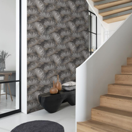 Декоративные веера с графичными узорами представляют собой яркий акцент на стене. Тёмные тона графита, таупа и розово-бронзовой гаммы, дополненные металлическими вставками, придают интерьеру современный и элегантный вид, идеально подходящий для гостиных и столовых.